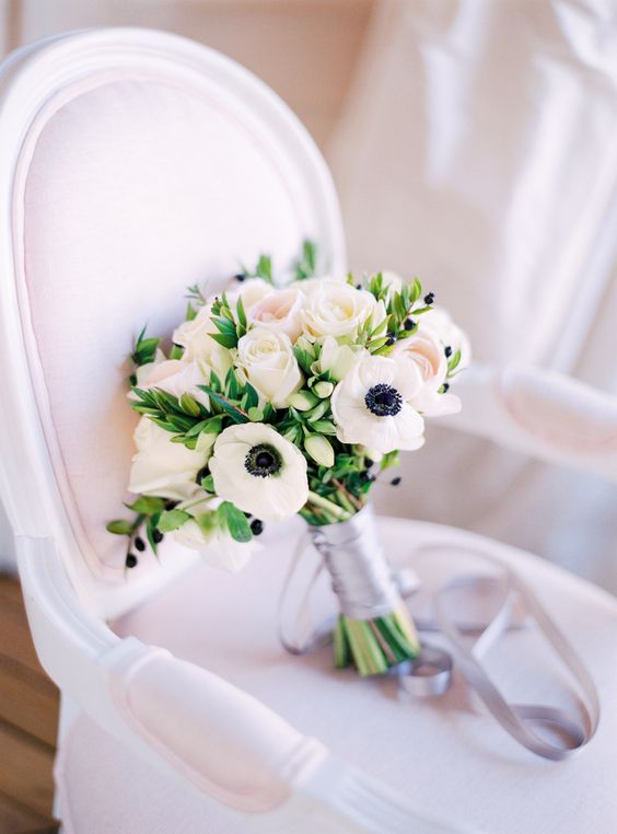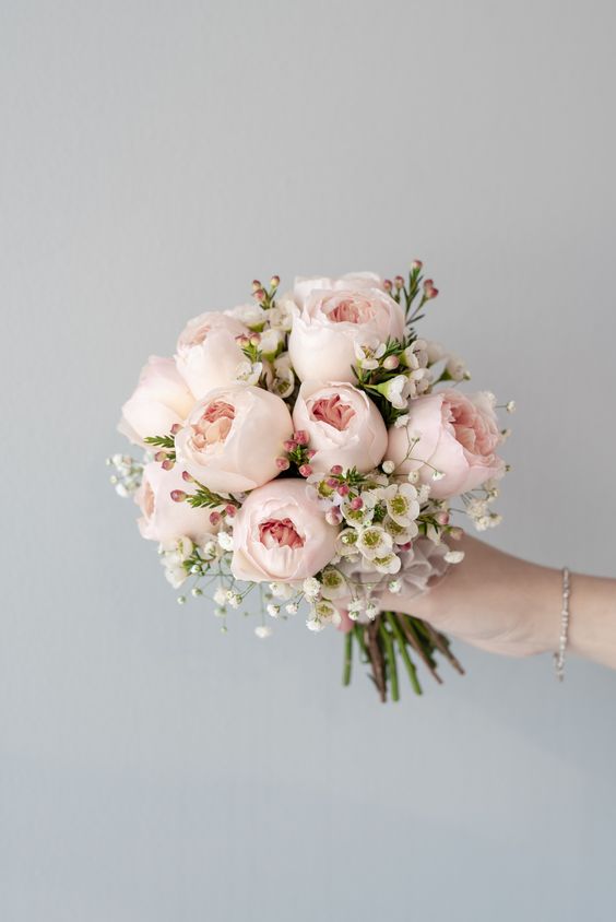 The quintessence of white elegant simple design, this bouquet is a pastel dream with its soft shades of blush and ivory. Peonies, roses, and a whisper of eucalyptus leaves create a small, simple fall bouquet that would complement any wedding dress beautifully. It’s a nod to traditional wedding flowers with a fresh, modern twist, making it a flawless choice for the bride who adores pink hues and timeless elegance.