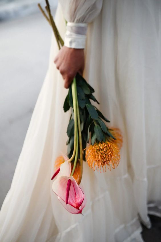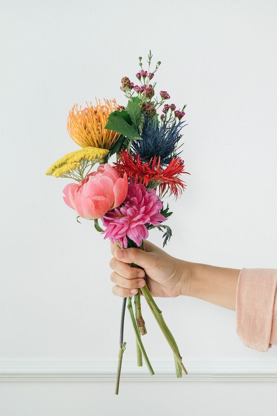 For the bride who is a true trendsetter, this bouquet is a feast for the eyes. An eclectic mix of textures and vibrant colors, featuring peony pink, fiery red, and sunny yellow, this arrangement is anything but simple. It’s a lively choice for a fall wedding, perfectly capturing the essence of the season’s boldness and beauty.