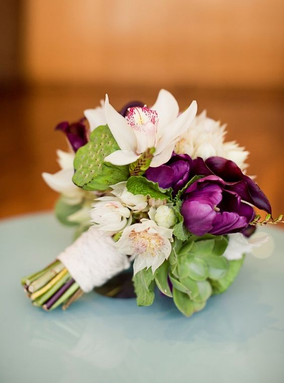 The cascade bouquet is reimagined with a luxurious twist, featuring a stunning line of vivid purple orchids. This bouquet is for the bride who desires a touch of opulence and exotic flair. It’s a breathtaking choice that pairs beautifully with a white elegant wedding dress, offering a striking contrast and a splash of color that will be remembered long after the wedding day.