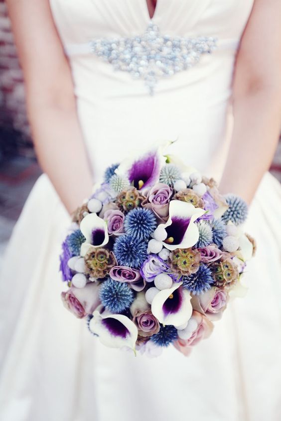 This bouquet is a marvel of rustic charm and sophistication. With a unique combination of blue thistles, purple roses, and white calla lilies, it offers an unconventional beauty that’s both elegant and boho. The subtle inclusion of succulents adds an unexpected twist, perfect for the bride looking to make a statement with her flower choices.