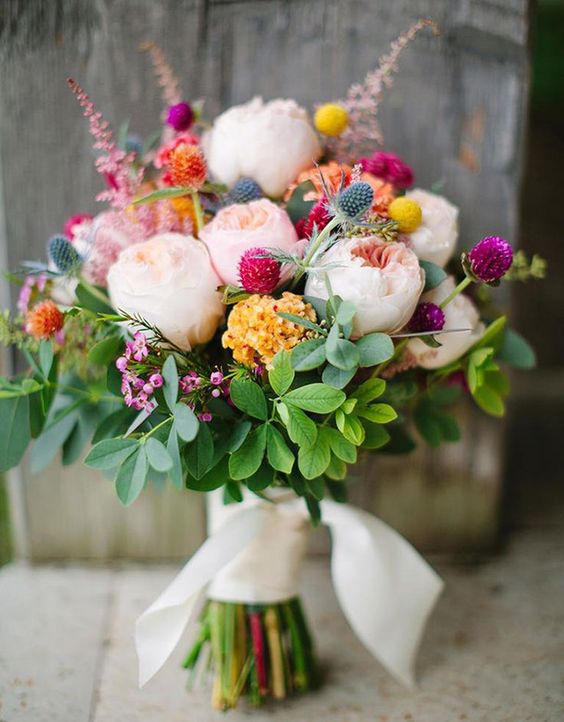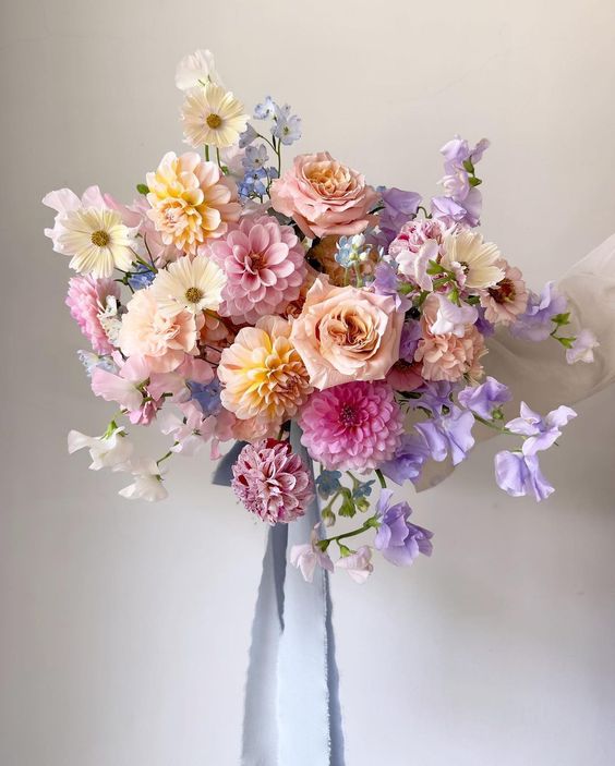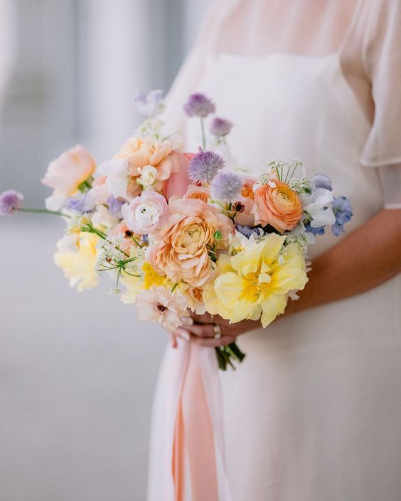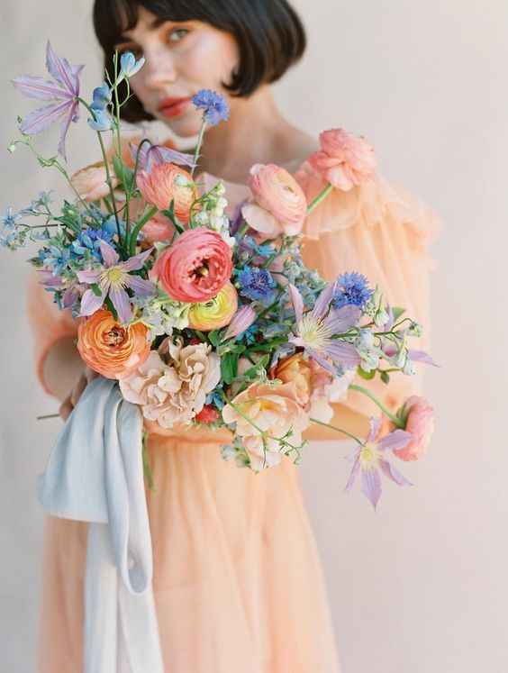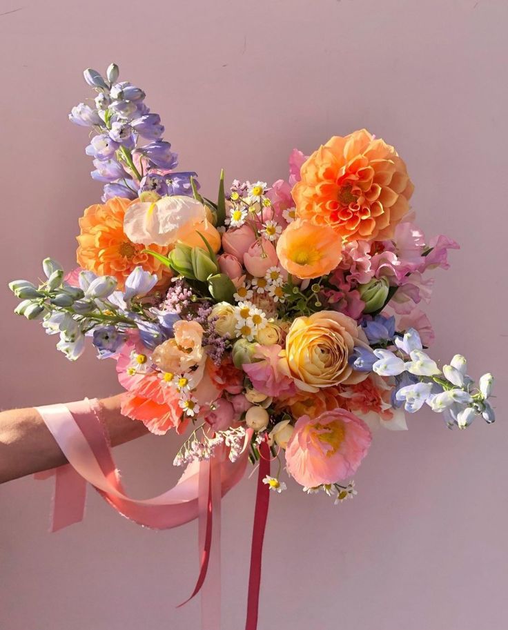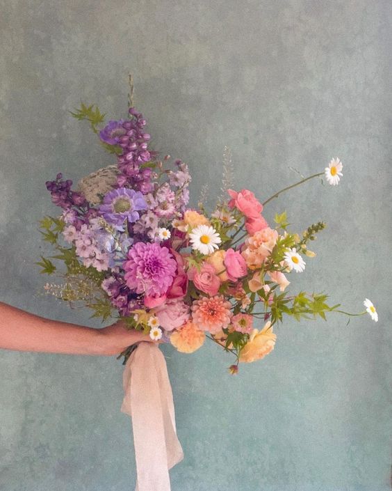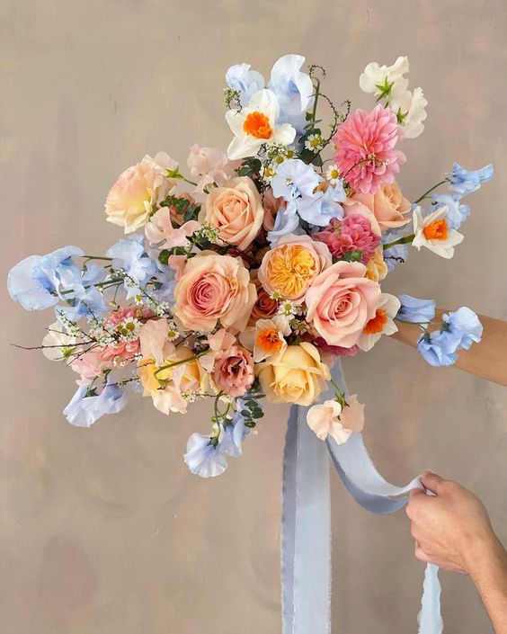 As we herald the arrival of spring, colorful spring wedding flowers become the centerpiece of celebration and joy. Picture a bouquet so vivid it looks like a masterpiece of nature’s art. This bouquet is a festival of color schemes blending harmoniously. Rich purples, bold pinks, and deep oranges dance alongside softer shades of peonies and anemones, creating a bouquet color scheme that’s both eclectic and elegant. The striking blue ribbons add a dash of modernity, ensuring this arrangement becomes a focal point for a wedding party or as a statement bouquet for a bride seeking a splash of boldness.