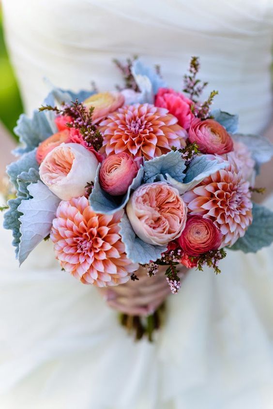 Finally, we encounter a bouquet that captures the essence of a spring morning. With its delicate pink dahlias, soft orange roses, and sunny buttercups, it presents a palette that’s both warm and inviting. This bouquet would not only make a beautiful part of the bridal attire but also serve as inspiration for centerpieces table arrangements, bringing a sense of harmony and grace to any spring wedding.