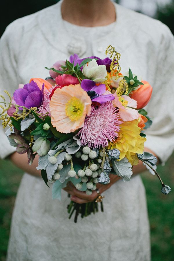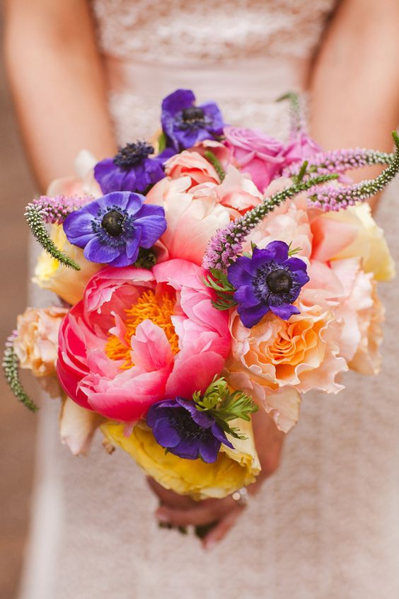 Now, behold a bouquet that revels in contrasts. Here, deep blue anemones stand out against the warm tones of coral peonies and sunny ranunculus. This arrangement is all about making a statement. It’s ideal for a bouquet that’s meant to be seen, to stand out in a family picture, or to complement a wedding dress with bold character. The addition of verdant greenery provides a balance, making it a compelling choice for centerpieces or bouquet rustic themes.
