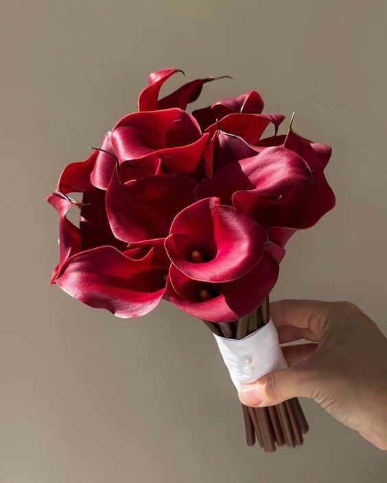Amidst the joyous celebrations of spring weddings, the bridal bouquet takes center stage, embodying the grace of the bride. Here, we find a clutch of calla lilies, their burgundy petals unfurling like satin ribbons. The bouquet is wrapped in an ivory ribbon, dotted with pearls—an ode to classic beauty. This arrangement whispers a story of timeless love, perfect for the bride who adores a touch of blush pink and cream.