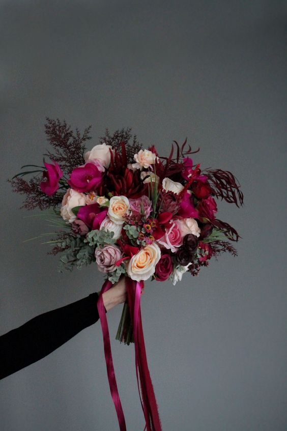 In the dim glow of the evening, a bridal bouquet becomes the beacon of the night. This composition, featuring deep burgundy, mauve, and dusty roses, is tied with long satin ribbons. It’s the perfect accessory for the bride who desires a touch of mystery, mirroring the quiet elegance of a winter wedding night.