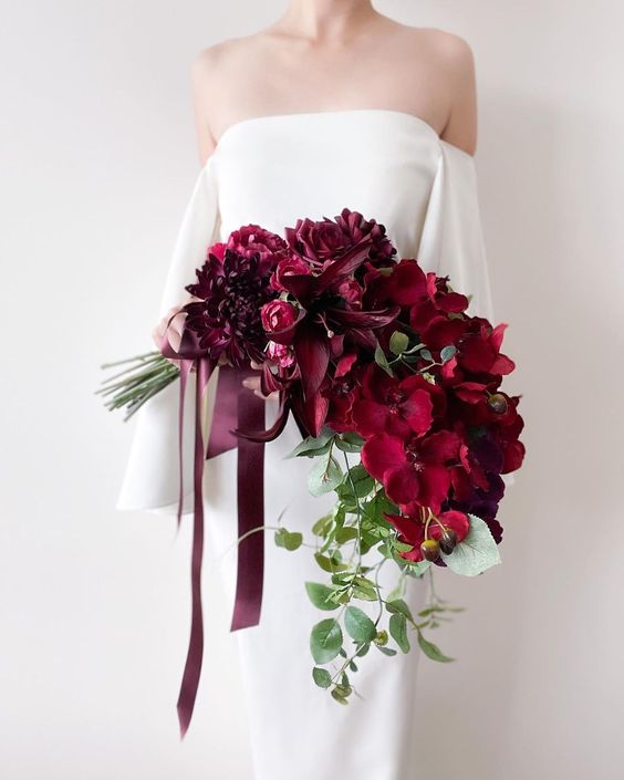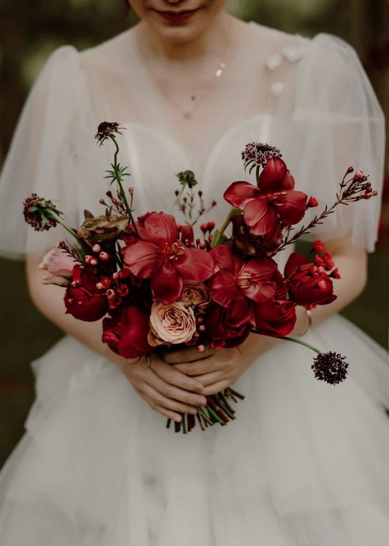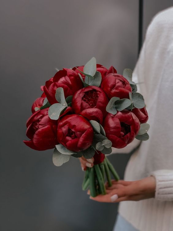 For the bride who finds beauty in simplicity, a bouquet of burgundy tulips and roses, accented with silvery greens, offers a nod to winter whites. This bouquet marries the elegance of white green with the depth of burgundy, creating a timeless accessory for a bride whose style echoes the serenity of a winter landscape.