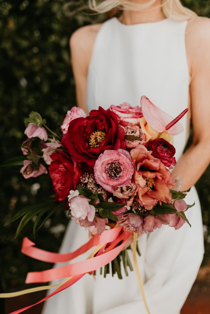 Vibrancy takes center stage as burgundy and pink flowers unite, accented with playful ribbons that catch the spring breeze. This bouquet is a celebration of life and love, destined for a wedding that’s as colorful and spirited as the couple themselves.