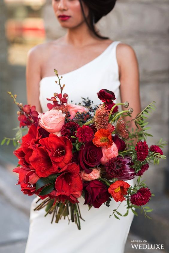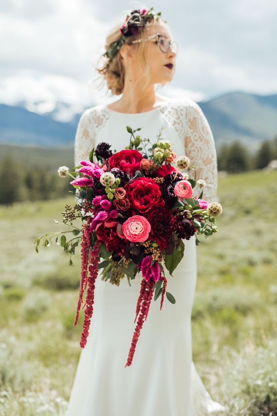 In the open air, where the sky kisses the mountains, a bride with a free spirit holds a bouquet that cascades like a waterfall of flowers. Deep burgundy and bright pink blooms, adorned with tendrils of green, flow down like a river of petals. This bouquet, embodying the essence of a fall wedding, offers a prelude to the richer tones of October celebrations.