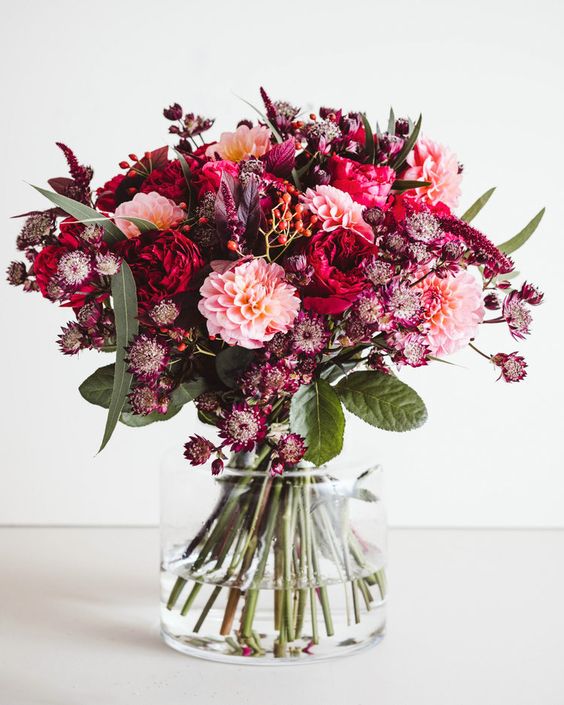 A centerpiece is more than an arrangement; it’s a reflection of the couple’s shared aesthetic. Here, pink dahlias and burgundy blooms stand proudly in a clear vase, their stems artfully arranged. This centerpiece brings a blush of color to any wedding table, harmonizing with a navy and purple color scheme and setting a mood of sophisticated charm.