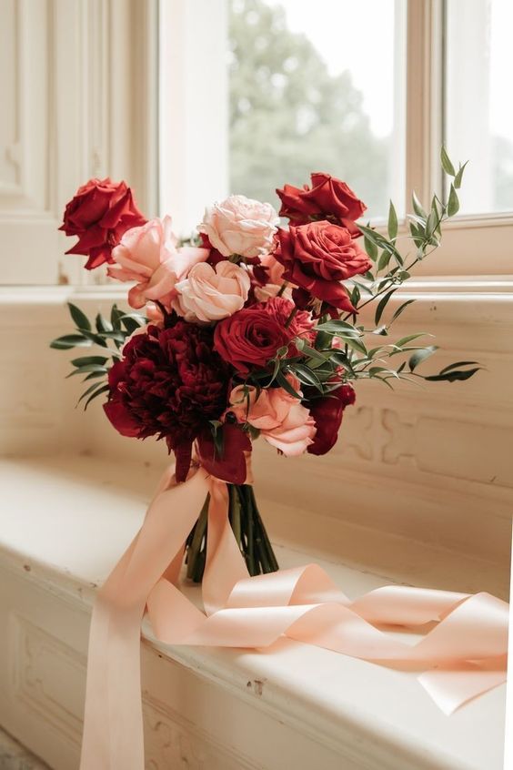 A confident bride holds a bouquet that is a modern masterpiece. Luxurious burgundy petals blend with soft peach tones, creating a contemporary vision perfect for an urban chic wedding or a celebration adorned with pink and cream.