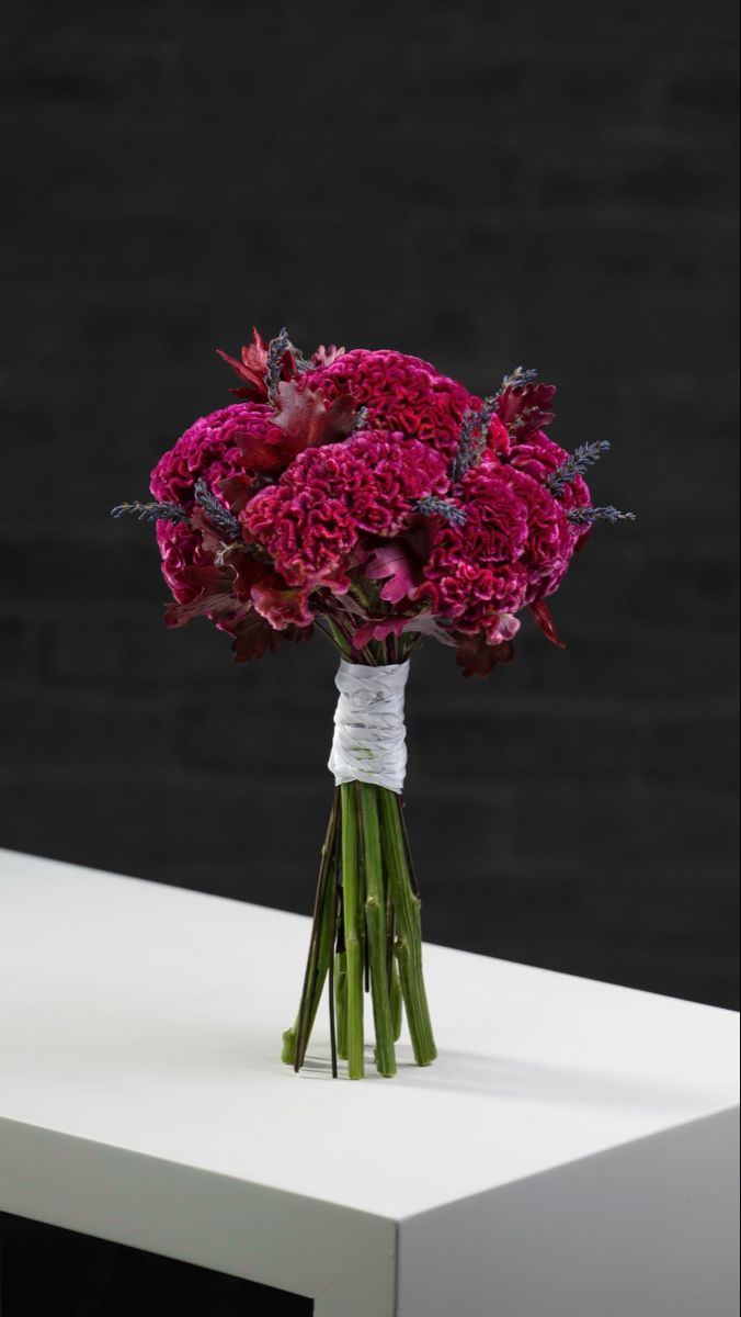 Texture takes the forefront in this bouquet wedding piece, where ruffled pink celosia and burgundy flora create a tactile experience. Set against a minimalist background, this bouquet thrives in contrast, ideal for an avant-garde wedding or a bride who loves blue accents.