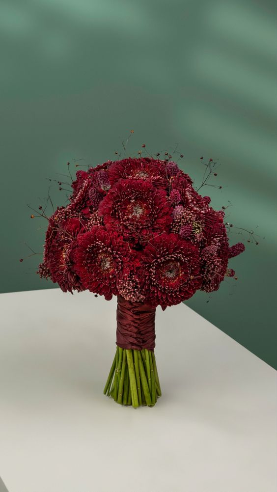 Velvety burgundy zinnias, coupled with delicate seed pods, create a bouquet that’s a symphony of texture and depth. Wrapped in a matching burgundy ribbon, this arrangement resonates with the richness of fall weddings and would complement an arch draped in white and green.