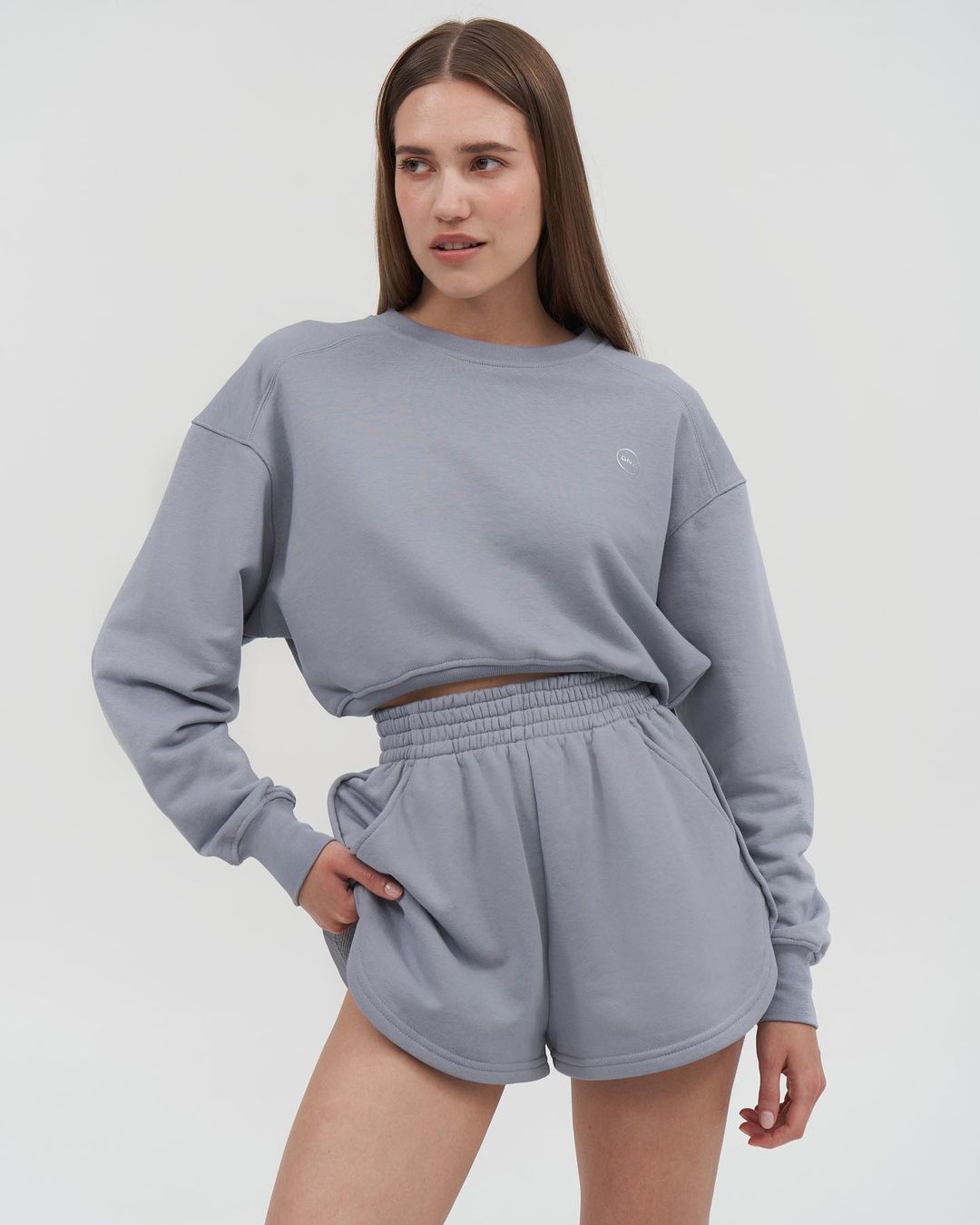 This outfit features a matching grey sweatshirt and shorts, offering a unified and refined casual look. The top has a subtle logo on the left chest, adding a minimalistic brand touch. The smooth fabric suggests comfort and ease, making it ideal for relaxed days at home or quick errands.
