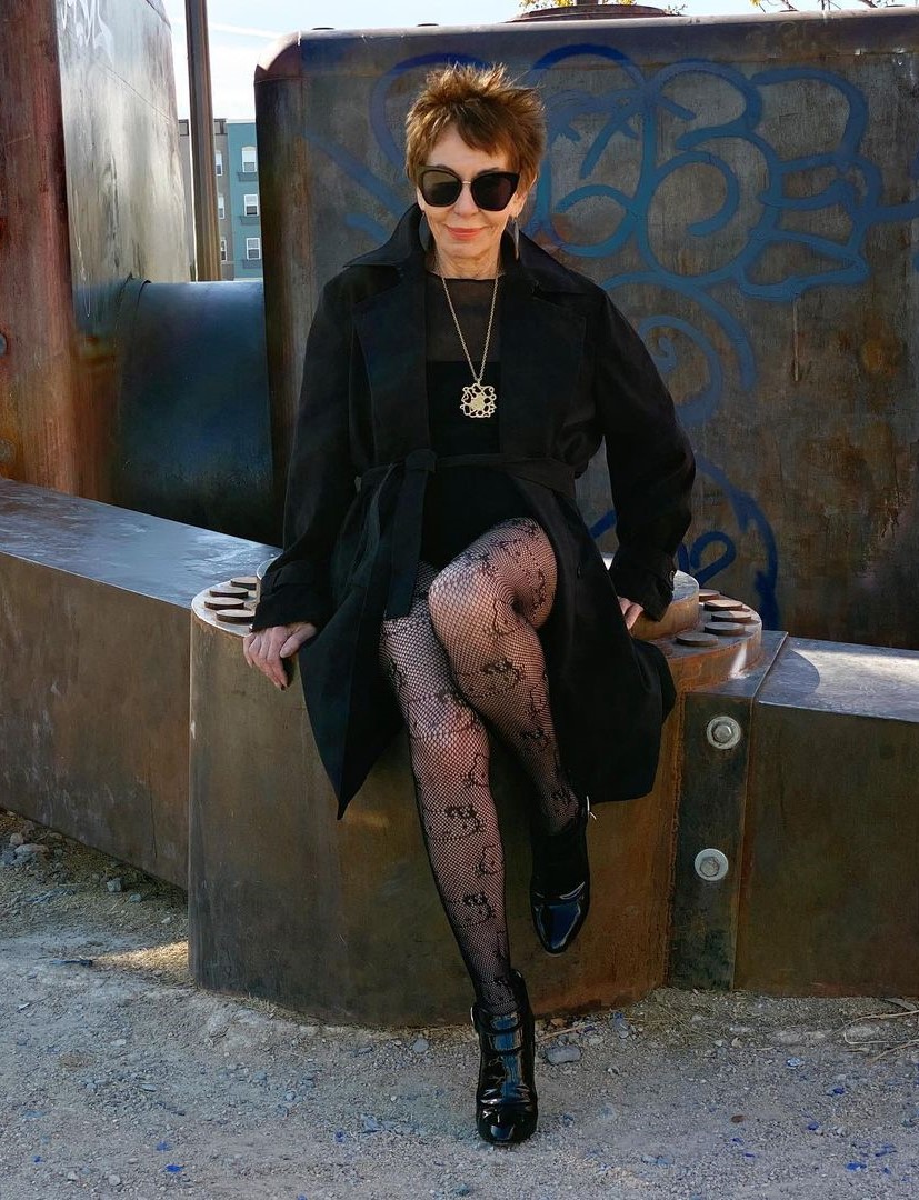 When it comes to fall looks for older women, this outfit exemplifies a sophisticated and stylish approach to cooler weather fashion. The ensemble features a black trench coat that adds a touch of classic elegance, paired with patterned tights that bring a modern twist to the look. The wearer’s accessories, including the oversized sunglasses and statement necklace, enhance the overall outfit, creating a polished yet contemporary appearance.