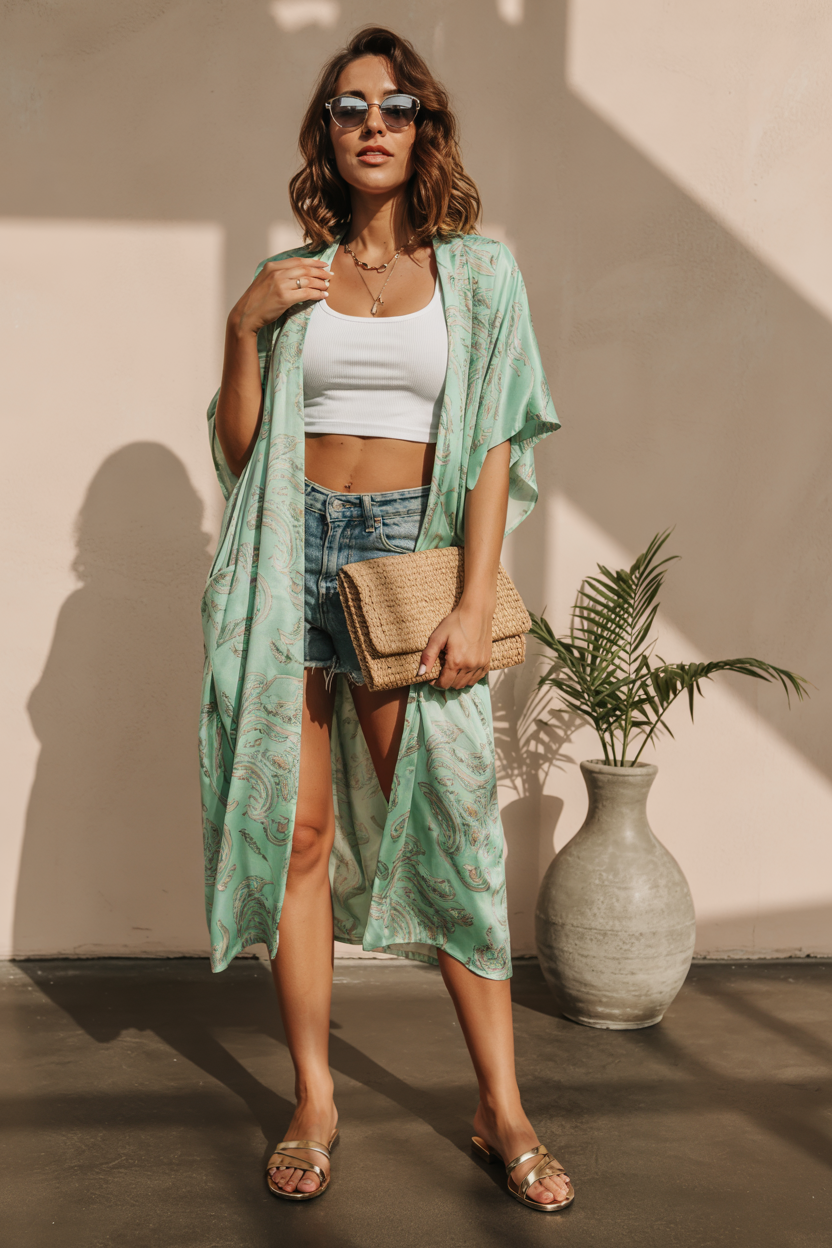 This outfit consists of a white crop top with a fitted shape for casual wear, and the mint green kimono adds a flowing, draped fabric with elegant patterns. The combination of traditional denim shorts and high-waisted design creates an essential outfit for summer 2025 fashion. The combination of a woven clutch and gold sandals takes the outfit to vacation style. Great for camping, lazy weekends, or exploring the beach town.