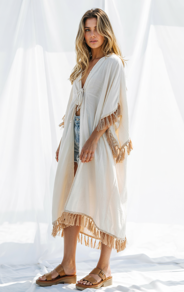 A cream-colored, wide-open cover-up with subtle fringe detailing and tie-front closures makes for great casual beachwear. When paired with distressed shorts, this outfit retains its beach appeal while maintaining its fashionable quality. The open fabric design makes it ideal for trips to summer destinations in 2025 as well as for country vacations. A simple pair of sandals will see you through the changing day from its early start to nightfall.