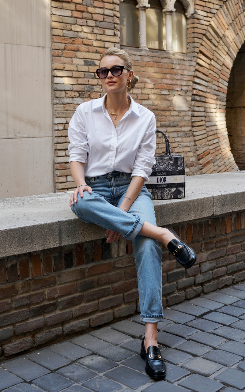 A white shirt paired with light-washed jeans creates a classic outfit that is both timeless and stylish. White shirt cuffs rolled up to the elbows, paired with black low-top shoes, maintain a casual feel while adhering to the fashion principles of 2025 street style. Gold embellishments accentuate the straight lines while keeping the design harmonious. A sophisticated yet comfortable option for everyday wear or even church mornings.