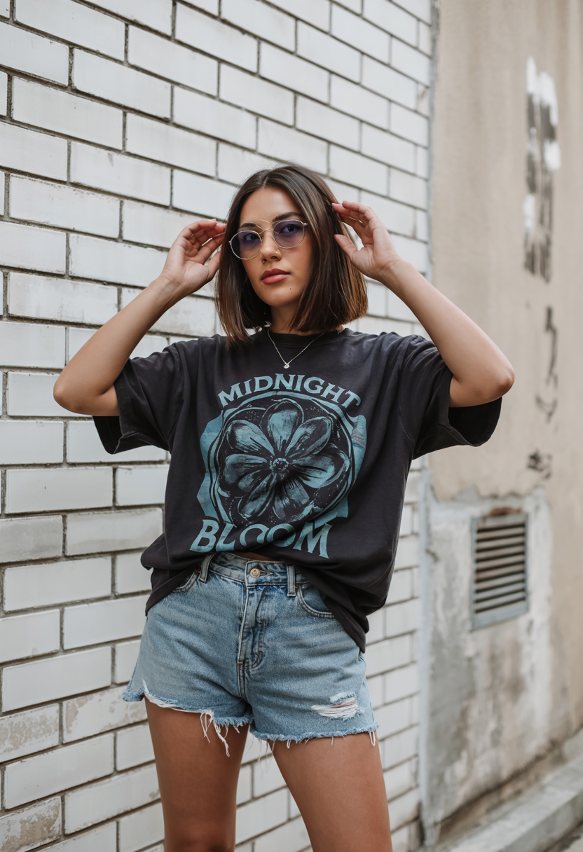 An effortlessly sporty outfit combines an oversized black graphic tee with high-rise denim shorts for a basic look. Threading destroys the bottom of the shorts for an attractive, solid look that makes the outfit more casual yet fashionable. This torn outfit works well for running your daily obligations and attending school and lazy lazy afternoons. A favorite among simple, cute, and trendy summer pieces for 2025.