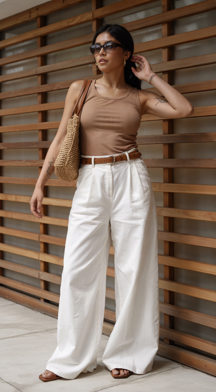 The easy-to-wear aesthetic costume combines tan ribbed tank tops with pleated white wide-leg pants for a relaxed, stylish look. The woven belt and straw bag create the perfect vacation wardrobe for market shopping. Hot temperatures make this ensemble an ideal choice due to its earthy colors combined with breathable textile materials. The outfit has a simple yet grounded look that is perfect for everyday wear in 2025.