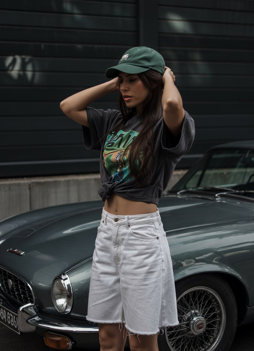 The sporty graphic tee looks more interesting when tied at the waist, adding definition and sleekness to this ensemble. Long white shorts team with the outfit for a carefree, expedition-ready style. The grounding street-style cap makes this outfit suitable for parties, camping, and city strolls. People looking for both comfortable and modern fashion in the summer of 2025 should consider this minimalist ensemble.