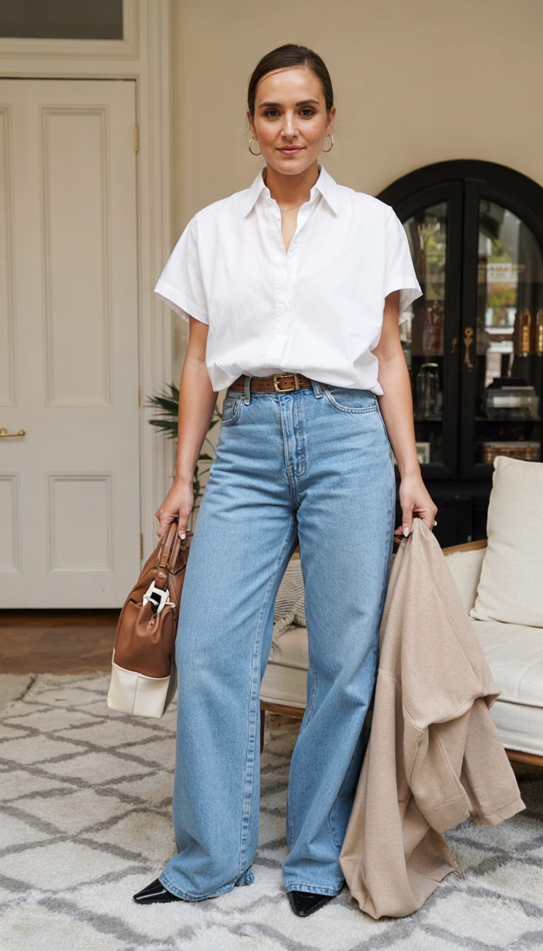 A perfect ensemble pairs a white button-up shirt with high-waisted wide-leg jeans for a sophisticated look that blends formal and casual styles. This outfit remains comfortable through the deep layers of fall thanks to its straight shape and soft color scheme. Accessories include a tan belt and a neutral handbag. A polished choice for school, church or daily errands in 2025.