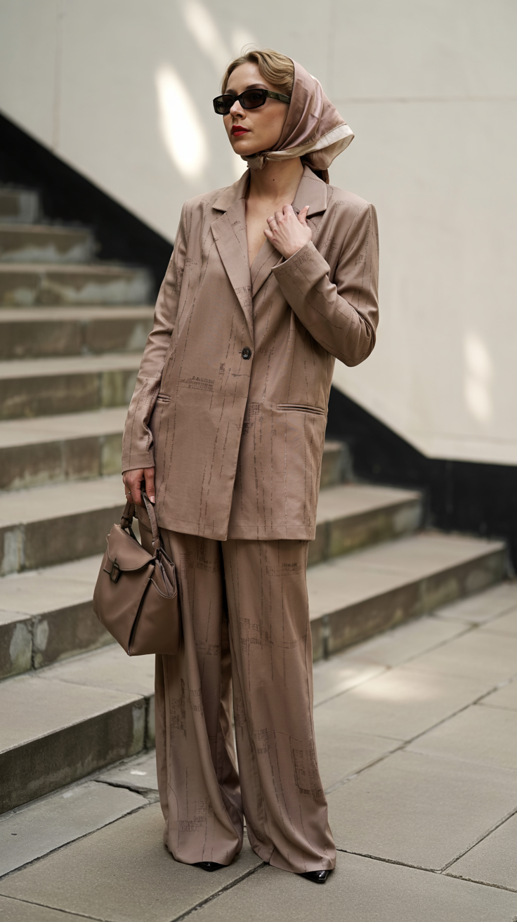 The formal matching suit features a structured design in a matte taupe color that creates a sophisticated look. The oversized blazer with wide-leg trousers offers a stylishly structured look and relaxed drape that is equally at home in the church as it is on the street. The silky headwear ups the outfit’s style quotient without compromising its simple and adaptable design. A bold yet simple choice for 2025 street styles.