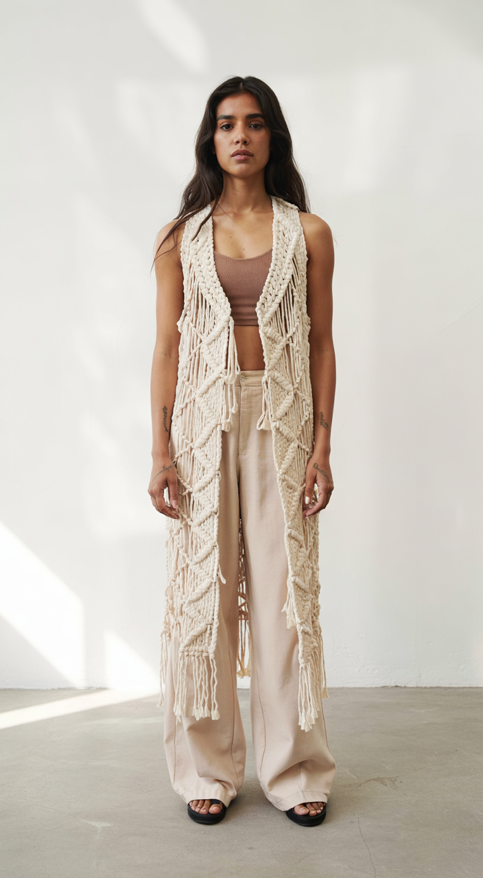 This fashionable outfit mixes a custom-made macrame vest with its eye-catching woven patterns to elevate the look. Wearing the athletic-style ribbed top with flowy wide-leg pants underneath the macrame vest makes this outfit perfect for casual summer living. The extended and fringed design of the vest gives the outfit a soft and camping-inspired appeal while maintaining a fresh and lovely look. The outfit appeals to individuals who prefer natural tones while pursuing the bohemian appeal of 2025 street fashion.