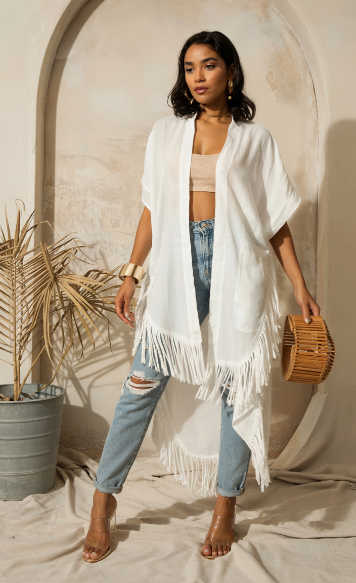 The long white kimono drapes smoothly over a basic beige crop top with delicate fringe details. The combination of distressed denim and transparent heeled sandals makes this outfit both aesthetically pleasing and stylish. Such an outfit combines both relaxed comfort and polished elegance, suitable for a deep autumn change or an urban stroll while on vacation. This outfit combines basic summer 2025 functionality with modern style and flexibility.