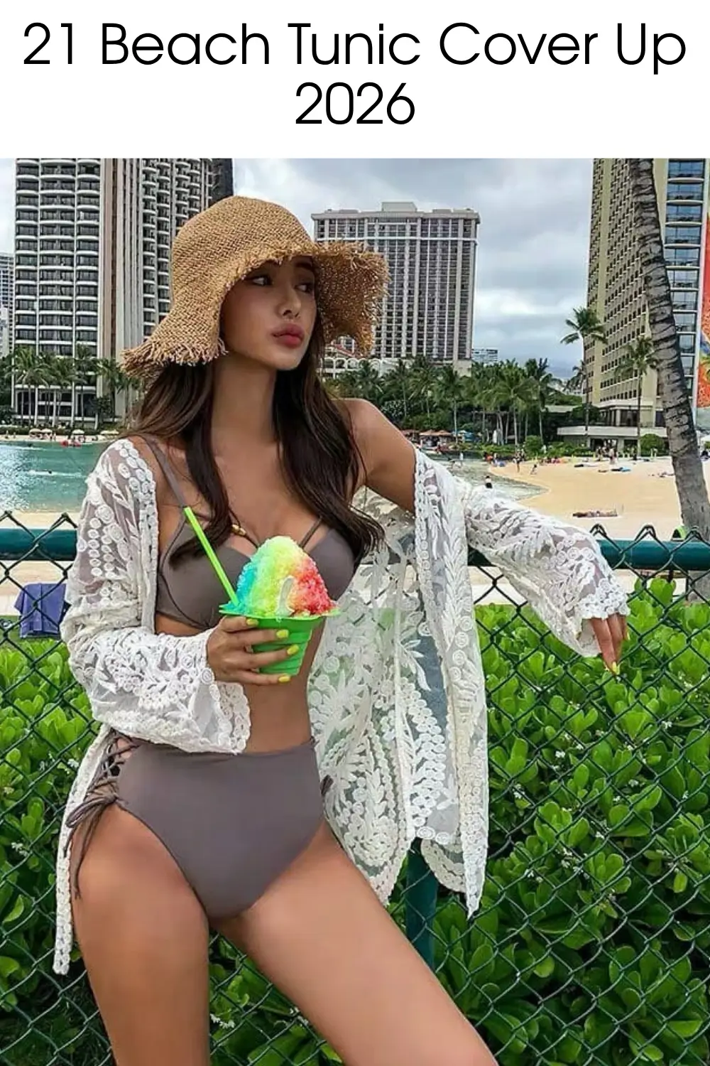 This one feels like a slow afternoon – a delicate lace tunic layered over a neutral Swim set, finished with a woven hat. It’s soft, feminine, and just a little romantic without going over the top. The open front keeps it practical for real Beach days.