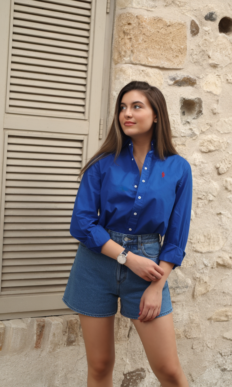 The structured button-up shirt in cobalt blue fabric is paired with high-rise denim shorts. The outfit exudes a well-groomed, yet laid-back attitude that allows you to move effortlessly from school activities to casual social gatherings to Sunday gallery visits. The crisp lines of the shorts blend harmoniously with the bold color of the shirt, giving the outfit an overall definition. This outfit is a classic choice among the shorts outfits for Summer 2025.