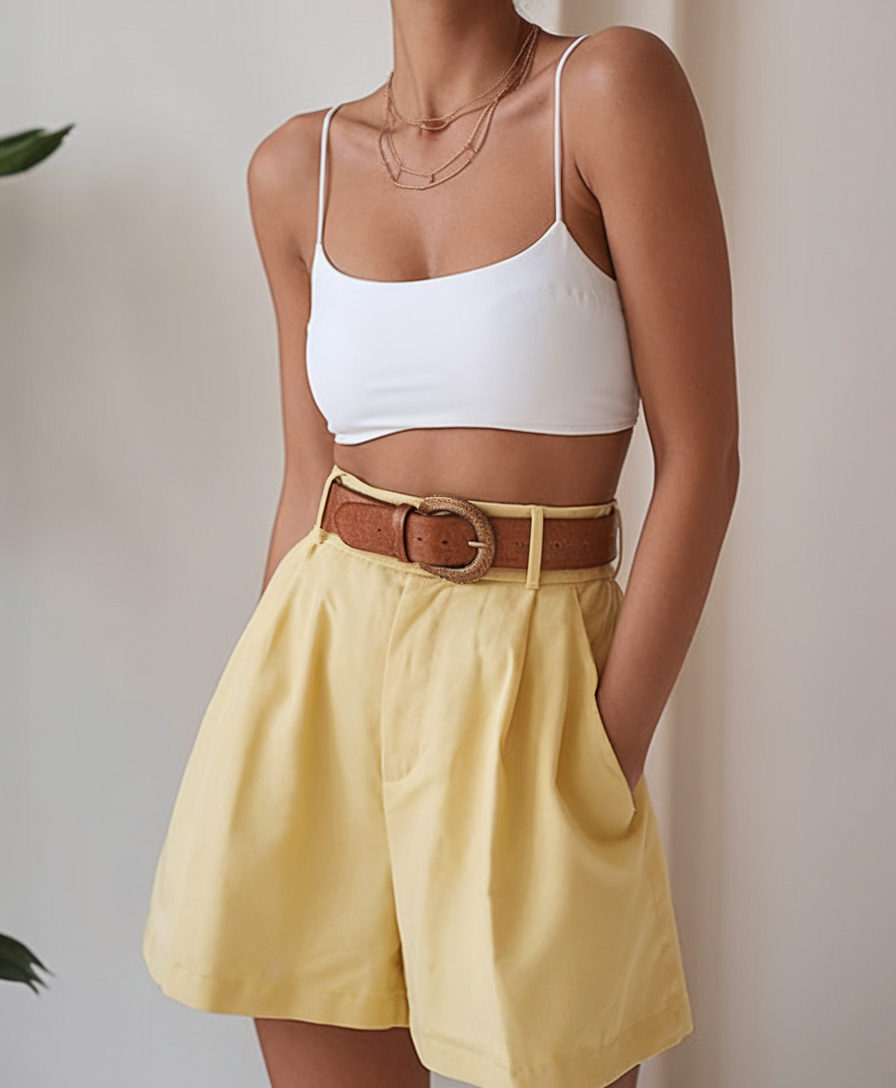 This ensemble combines fashionable white strappy tops with high-waisted pleated shorts in a soft pastel yellow fabric. A wide brown belt shapes the waist and adds a vintage appeal while keeping the outfit fashion-forward. This outfit can be found in mall shops and brunch spots and is also a design from Shein’s summer collection. Simple, breezy and totally ready for warm-weather dressing.