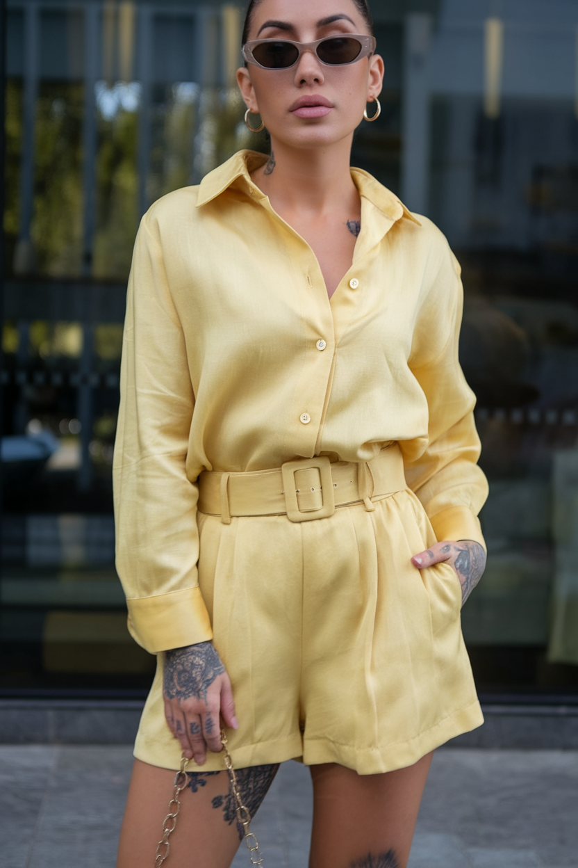 The Mustard Yellow Co-Ord outfit consists of a silky button-up shirt and matching belted shorts. The combination of pleats and high waist creates a sophisticated look that is equally at home at a hip music festival or an elegant night out. Its stylish look and fluid fabric blend elegance with modern street style. Definitely a standout choice in women’s holiday casual fashion this season.