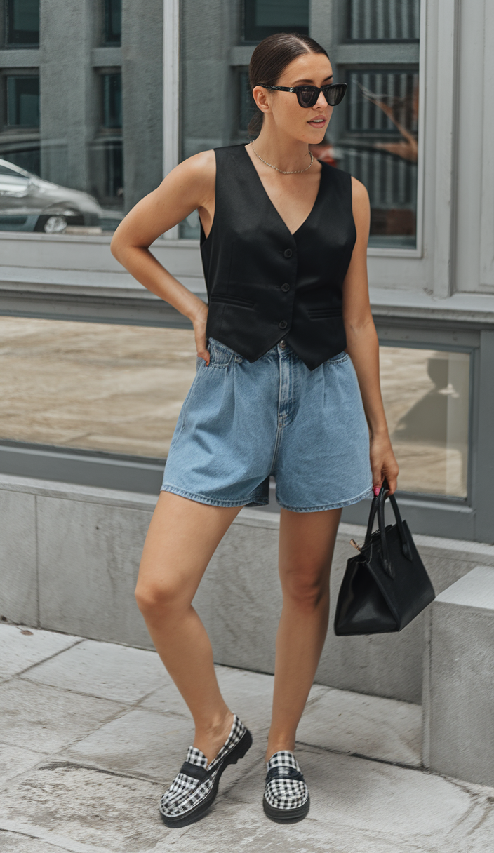 The outfit combines a black buttoned vest that provides a formal silhouette with loose baggy light denim shorts that create a relaxed and brilliant aesthetic. The shorts have a roomy design that maintains a comfortable, relaxed shape that lends itself to outdoor city strolls. Pair this outfit with plaid loafers and a sleek black bag for a sophisticated downtown look. Definitely a favorite in the shorts outfit ideas for Summer 2025 for its effortless mix of trend and comfort.