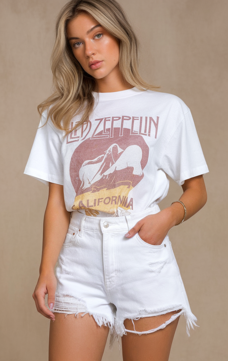 This bold outfit features a white vintage-style band tee paired with high-waisted distressed shorts. Summer-centric fashion concepts find the rugged short hem harmonious with trendy clothing schemes. These shorts are suitable for shopping trips as well as daytime festivities and carnival walks. The outfit remains accessible with its fashion-forward attitude, appealing to music lovers and laid-back trendsetters alike.
