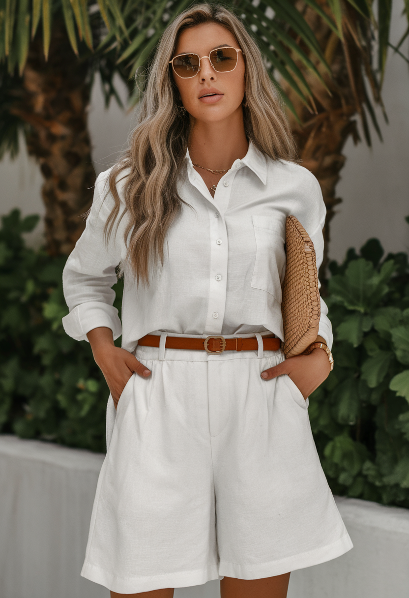 The ensemble keeps its polish with a full linen section of white pieces that include button-up sleeves underneath high-rise shorts. The tan leather belt cinches the waist, while the shorts offer long and airy comfort. The outfit stands strong as one of the leading short fashion choices for summer 2025, perfect for garden parties or weekend breakfast events. It represents outstanding summer casual wear.