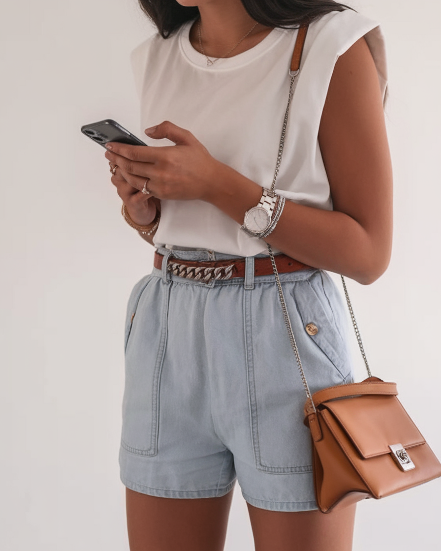 This outfit features a sleeveless white t-shirt paired with high-waisted light blue denim shorts. The outfit is finished off with an eye-catching belt and compact tan shoulder bag for a clean, down-to-business street aesthetic. The flexible denim shorts offer comfort along with style, making them suitable for shopping trips as well as simple work setups. The outfit maintains a simple elegance that leaves no doubt about its style points.