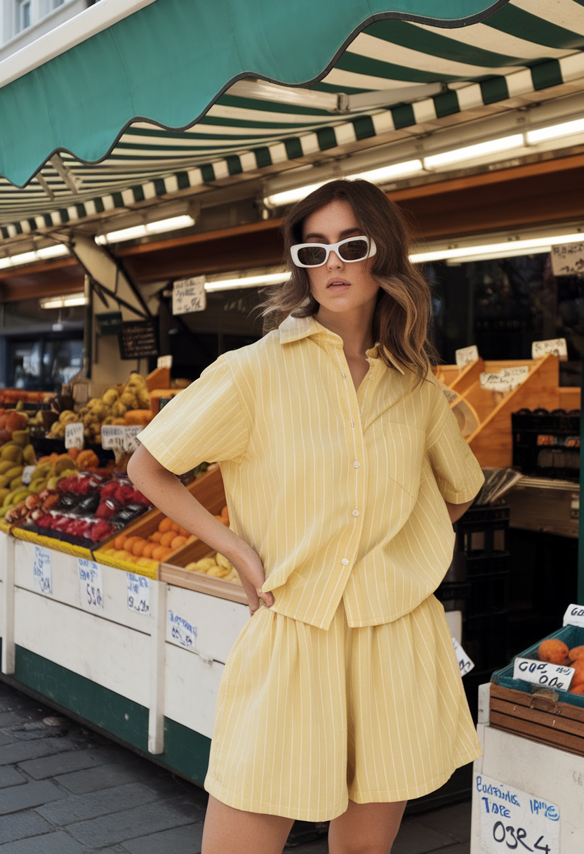 A striped button-down shirt paired with wide-legged shorts creates a casually sophisticated outfit. The women’s vacation casual fashion duo creates an excellent ensemble for visiting local markets along with cafes and carnival events. The comfortable fit of these garments gives them a comfortable baggy feel along with their fresh and contemporary color. This outfit selection offers urban elegance combined with everyday comfort.