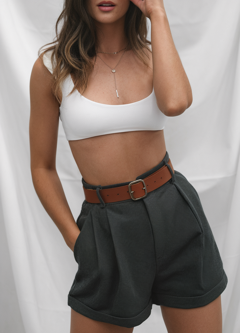 This outfit uses a simple white crop top with high-rise black shorts for a clean, sophisticated look. The shorts feature a rolled up bottom and shaped pleats that are secured at the waist with a brown belt. The outfit has many uses as it works well at rock concerts, late summer season and rooftop events. The simple color combination and sophisticated tails make this outfit a leading seasonal versatile fashion item.