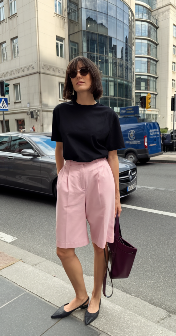 A black t-shirt looks stylish when paired with pink Bermuda shorts that feature a structured, high-waisted design. The longer length and straight shape of these Bermuda shorts allow for a sophisticated finish that works for casual urban exploration as well as a stylish mall ambiance. Minimalist fashion meets colorful flair in this outfit that pairs diagonal flats with deep plum handbag accessories. A subtle and polished choice for the modern fashionista.