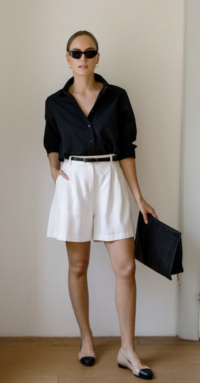 A black collared shirt looks exquisite under structured white pleated shorts. The strong waistline and thick belt add shape to the ensemble’s sleek design elements. An elegant clutch paired with plain flats completes the stylish outfit. This sophisticated take on the summer 2025 shorts outfit is perfect for rooftop dining or shopping at the mall.