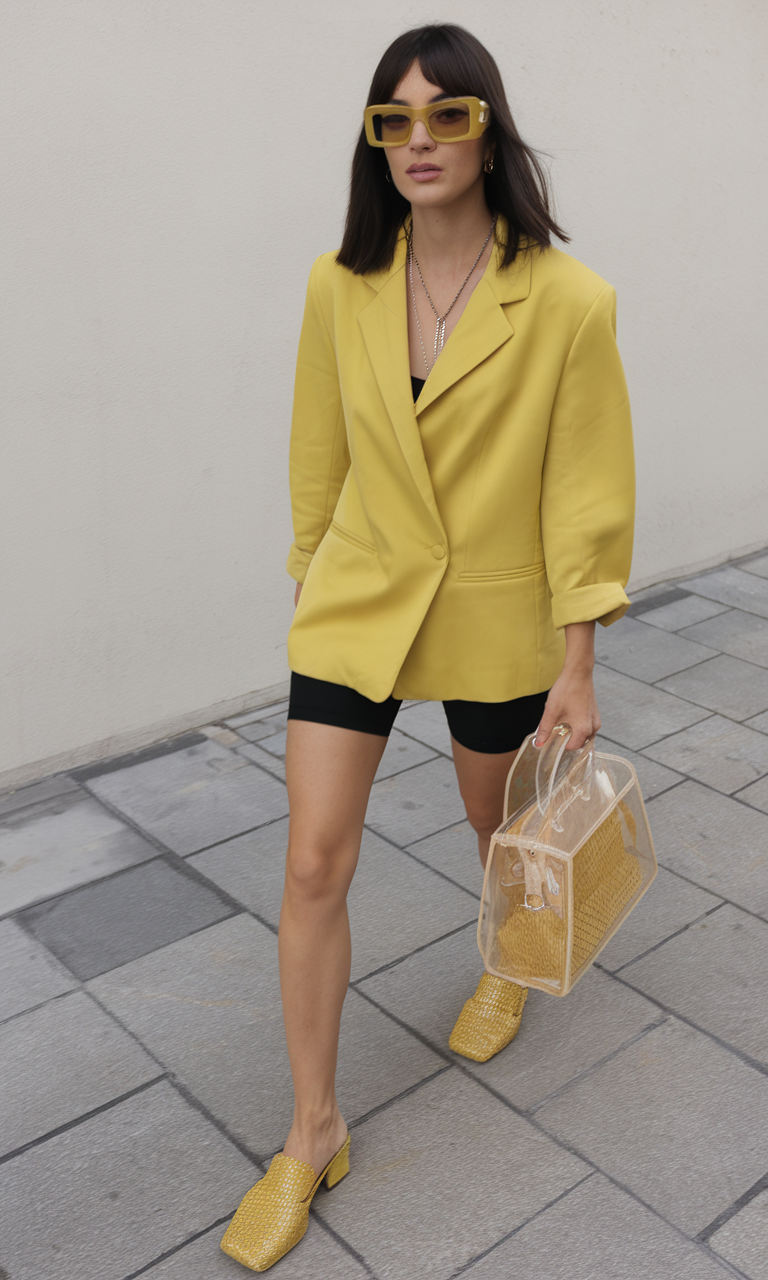 The combination of a bold yellow blazer and fitted black biker shorts creates a strong streetwear-inspired effect. The wide cut of the blazer gives authority to the body shape and the short cut of the Bermuda shorts creates an athletic contrast. The outfit is completed with yellow mules and a transparent handbag, which together with the matching shoes will make you ready for any high-intensity summer event, such as rap shows or downtown activities in 2025. A daring option among the shorts outfit ideas for summer 2025.
