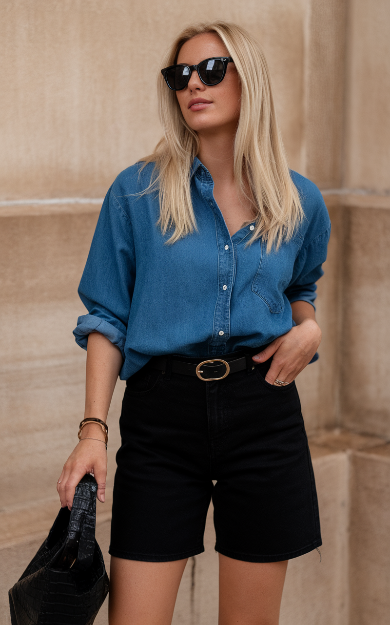 For a comfortable ensemble, pair a traditional denim button-down shirt with black high-waisted shorts. The relaxed style of the shirt blends with the stylish shorts, which are given an extra touch of elegance by the statement belt. This pairing feels timeless and sophisticated, great for a school-inspired look or a fashionable city stroll. A staple combination in shorts outfit ideas for summer 2025.