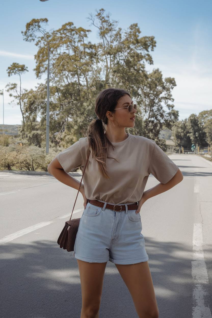 The combination of light blue high-waisted denim shorts creates a casual look that is balanced by a loose taupe t-shirt. A small brown belt and a tucked-in top add order and class to this simple outfit design. This combination provides a relaxed look that works for the school day as well as the weekend shopping mall. Shorts outfit ideas for the upcoming summer of 2025 often include this particular combination.