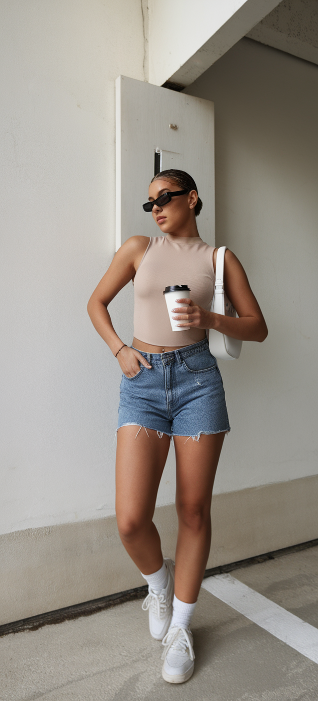Nude ribbed tank tops sit underneath mid-rise denim shorts that are gently frayed at the bottom. The pattern fits any body shape by revealing curves without claustrophobic tightness, and delivers both mall exploration elegance and casual afternoon charm. The outfit is kept cool by the combination of white sneakers and a structured white bag. Such a casual denim outfit effortlessly transitions from casual daytime responsibilities to carnival events.