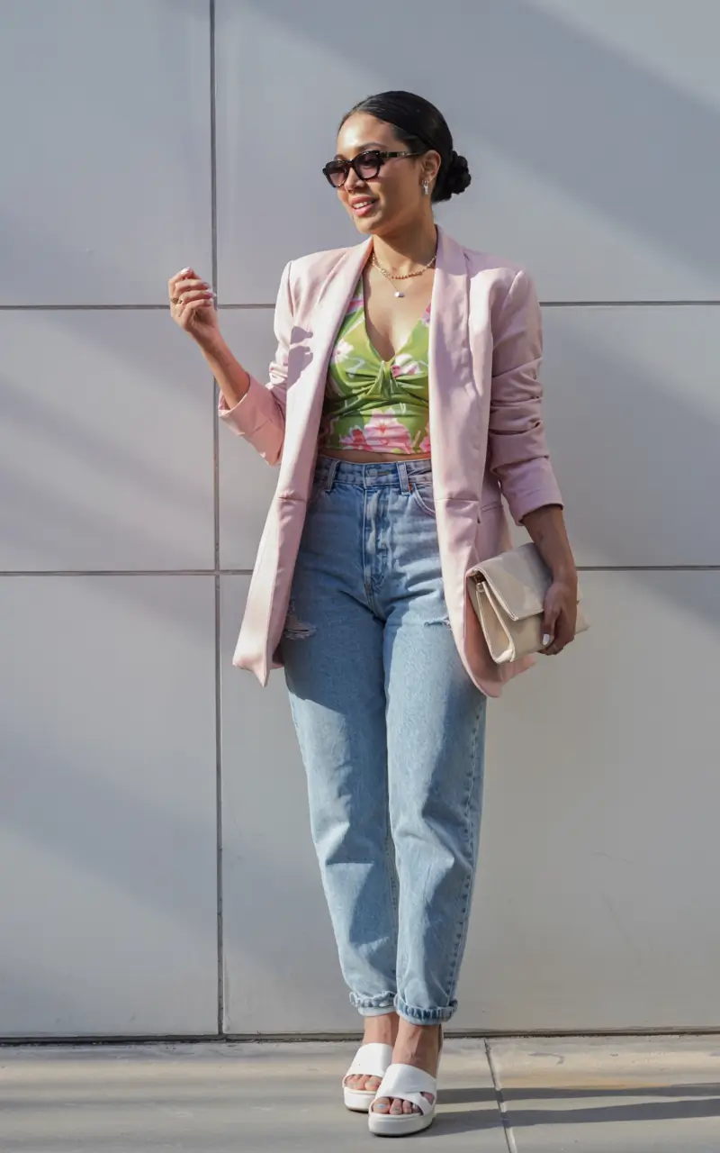 A long blazer in soft pink sets a feminine tone against a green and pink floral crop top. Light-wash denim provides a relaxed casual appearance when worn with this outfit while platform sandals combo with a clutch makes it a summery elegant look. This outfit showcases how blazer outfits for women summer 2025 balance polish and playfulness. The outfit design with precision layering delivers open-air comfort and slight architectural elements in the fabric.