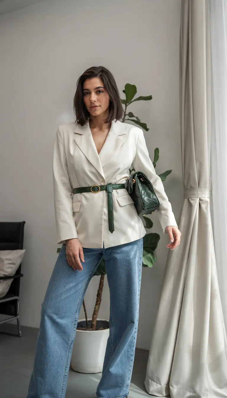 The white blazer receives its shape from a green belt that cinches in at the waist. Small curves on the structured design pair naturally well with wide-leg denim to create a smart and relaxed style. A shoulder bag constructed with quilted green fabric complements the ensemble through its style and slight textural aspects. This fashionable blazer ensemble represents a sophisticated version of women’s summer 2025 garments which suits current urban fashion trends.