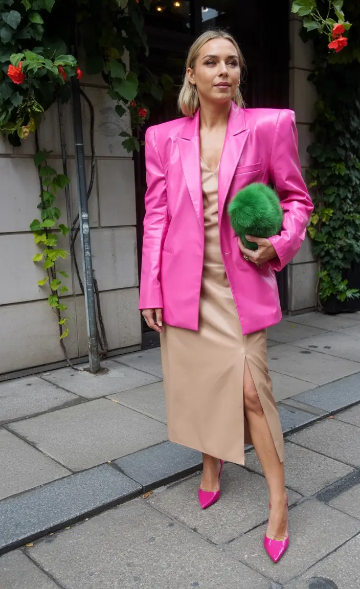 A sleek beige slip dress with a front slit gains bold contrast from this structured pink blazer. The square have and shine on the fabric boost the strength of an otherwise simple outline. The green furry clutch keeps the look youthful by softening the strong contrast effects of the color-blocking. A style combination uniting powerful confidence with vibrant color creates attention-grabbing blazer clothing for female wearers during summer 2025.