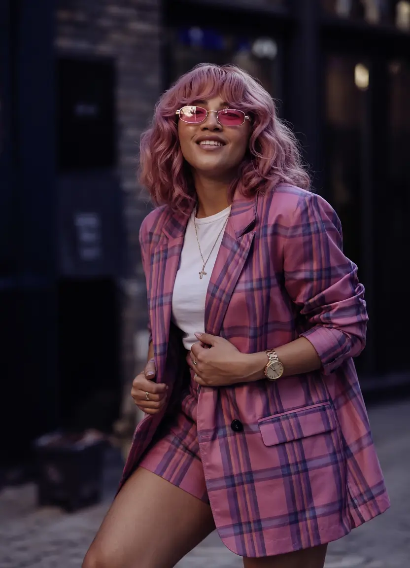 The purple-pink plaid blazer pairs with matching shorts creating a relaxed appearance when worn with white T-shirt below. The oversized blazer features relaxed cut stitching while high-waist shorts maintain the defined shape of the silhouette. The outfit gets its finishing touch from rose-toned sunglasses and gold accents. The design presents fashionable sales for women’s casual wear which preserves its style and harmony.