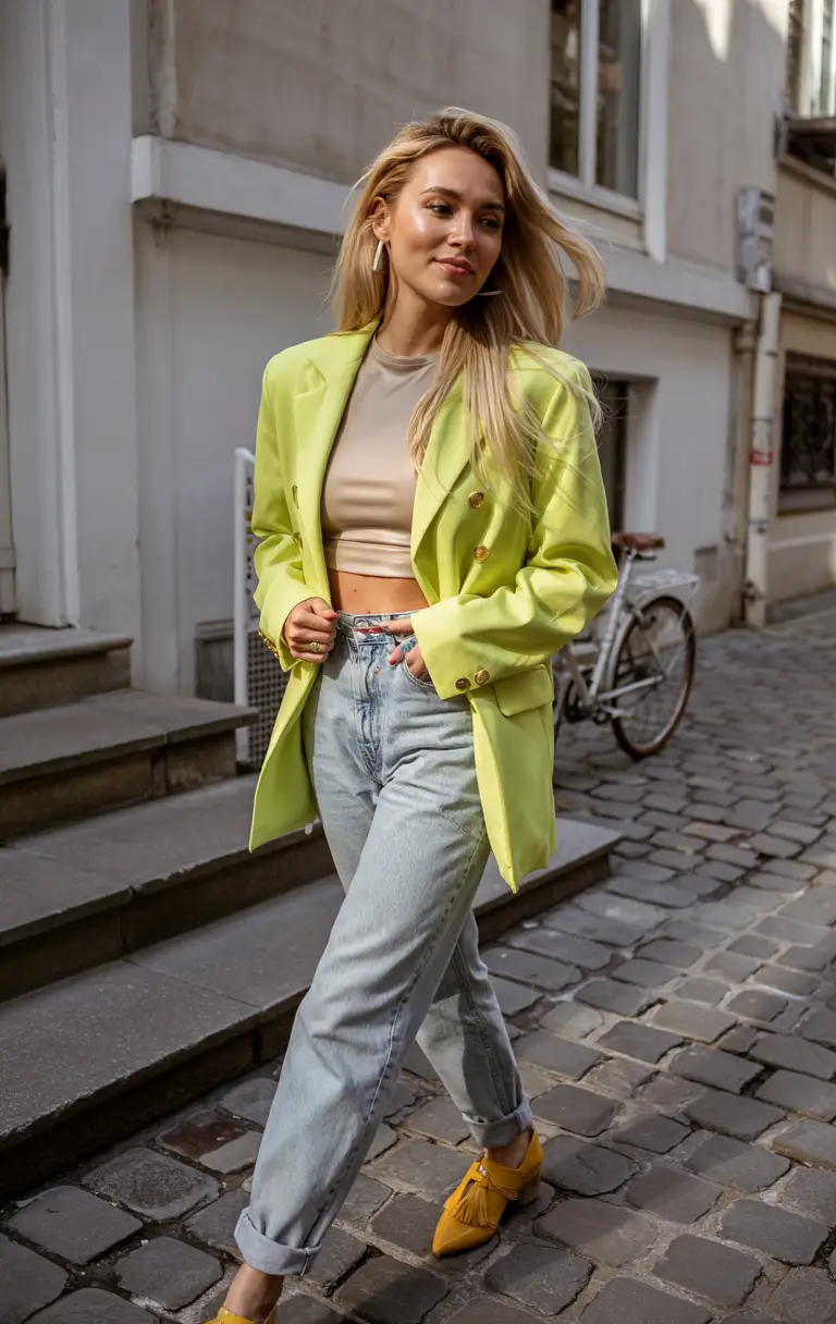 A remarkable look shows a yellow blazer with double-breasted design which is worn over a form-fitting beige crop top. Light-wash dressed jeans provide cohesion to the vivid outfit while rolled cuffs create a casual fit. The pointed loafers complete this look through their matching orange shade with the blazer. The outfit represents a vivid and friendly approach to fashion-forward summer streetwear for women.