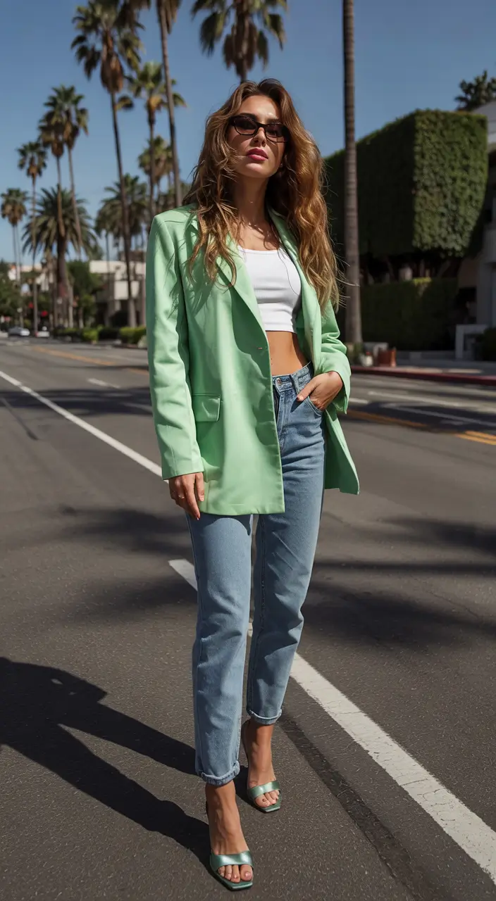 The vibrant light green blazer functions as a sun-ready addition to a white crop top ensemble. The outfit becomes grounded by basic yet convenient straight-leg denim jeans. Uncoverage metallic heels bring sophistication to the whole ensemble. This arrangement provides a delightful interpretation of the summer 2025 blazer outfits for women through a novel approach to essential clothing.